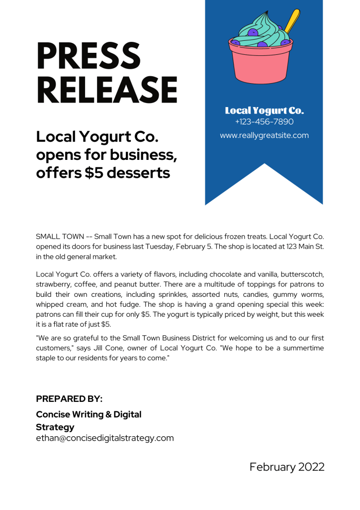 Notice how the PR is short, concise, and straight to the point. It clearly states that there is a new frozen yogurt business in town and that it is offering a special $5 deal for its grand opening. The PR includes the address of the business, a sample of its menu, and a quote from the owner. It also lists contact information for the press to get in touch to conduct interviews.